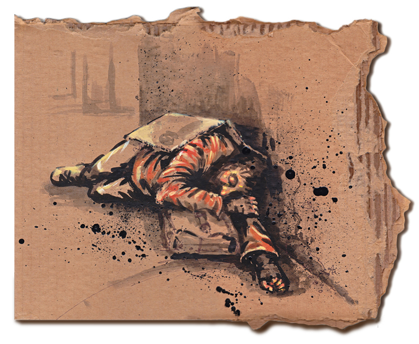 Ink and acrylic painting on cardboard, “Homeless” By: Sylvia Arthur